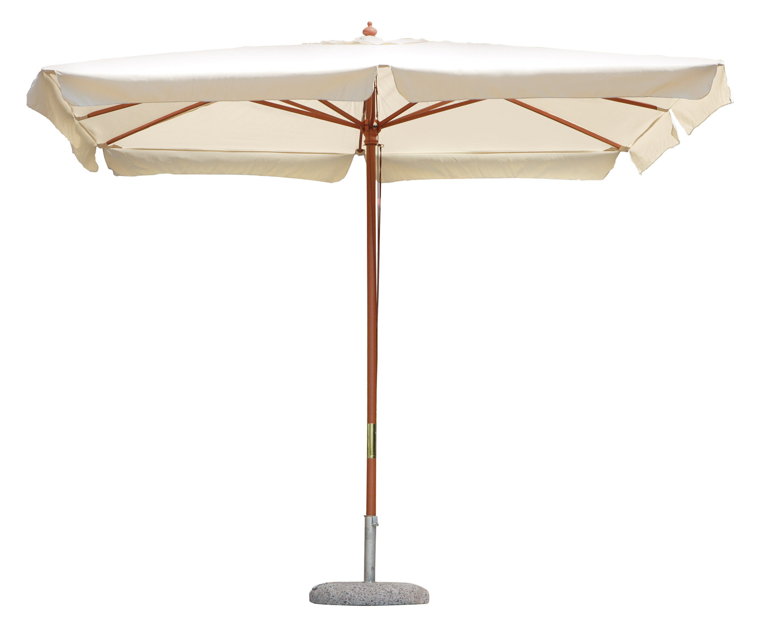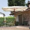 L’apertura è gestita tramite doppia carrucola, un sistema pratico che consente di regolare l’ombrellone con facilità e precisione. Le bacchette da 17×23 mm in legno massiccio garantiscono una perfetta tensione del telo, conferendo stabilità e robustezza anche in condizioni di vento moderato.