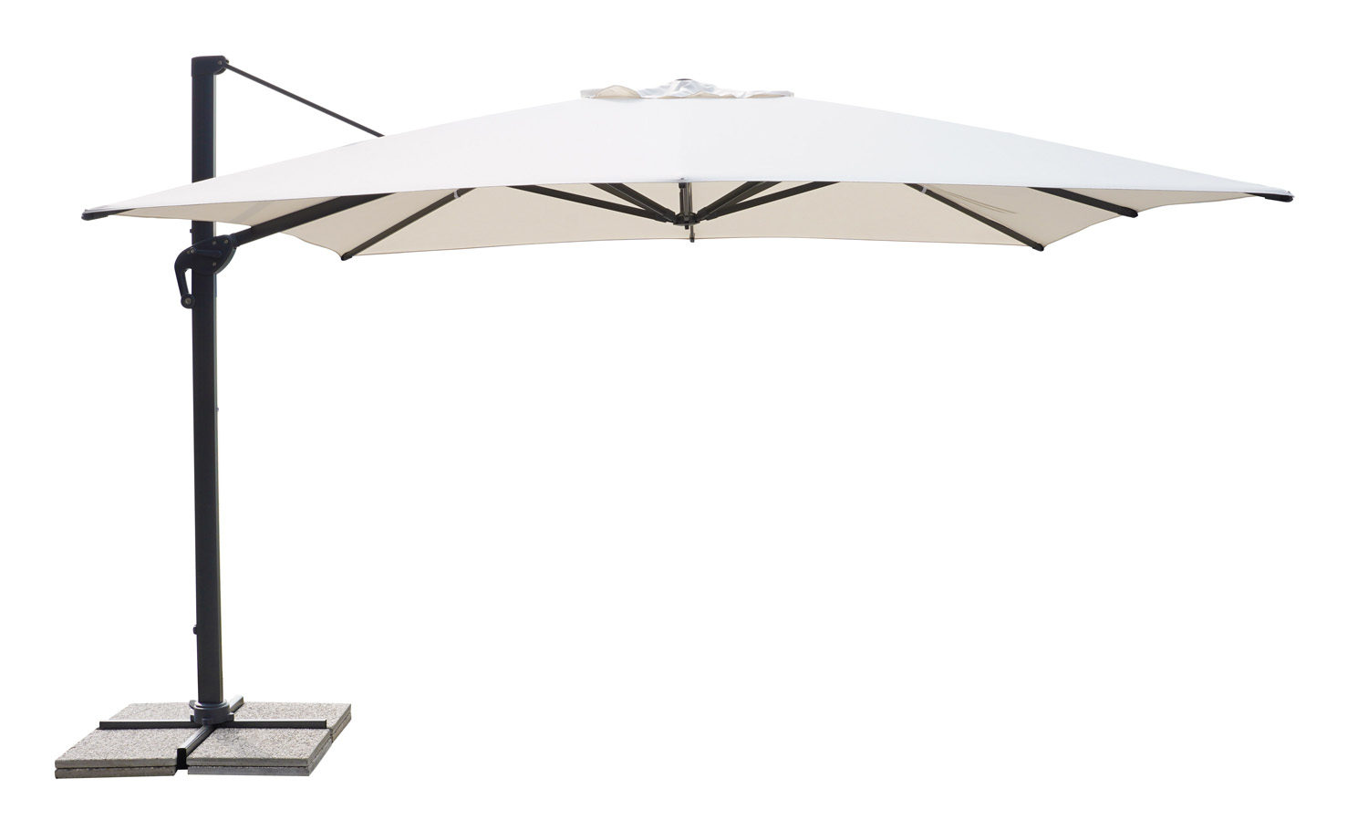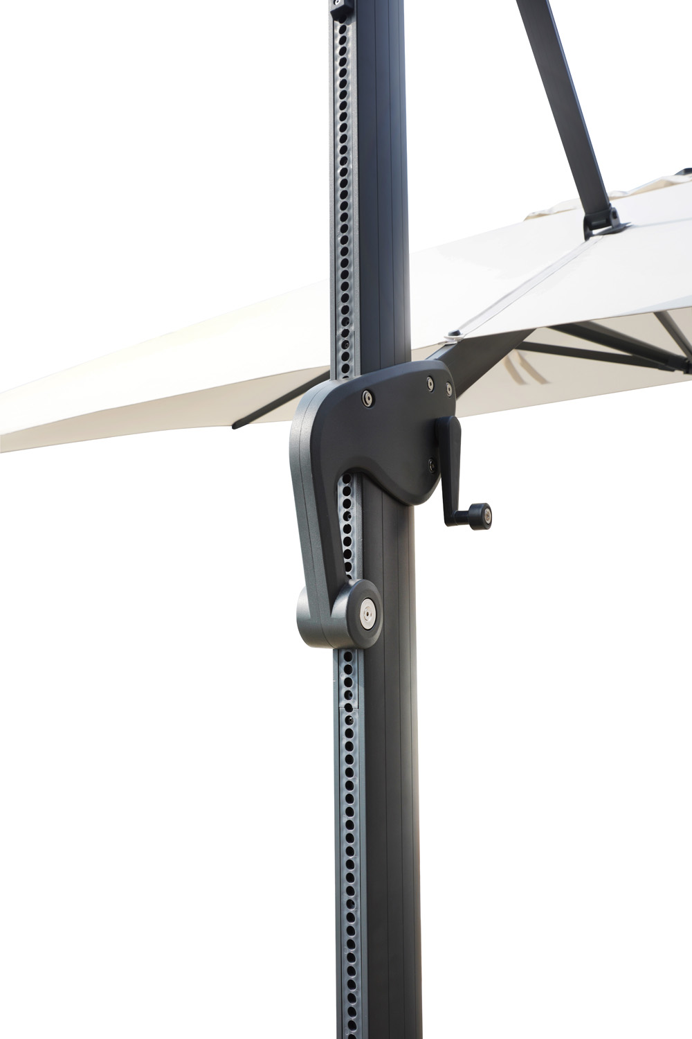 Il fusto antracite con maniglione integrato conferisce un aspetto contemporaneo e raffinato, perfettamente adattabile a qualsiasi stile d’arredo outdoor. Il palo ovale in alluminio 100x60x2,2 mm assicura stabilità e robustezza, mentre le bacchette da 33x20x1,2 mm garantiscono un eccellente supporto strutturale al telo, offrendo un equilibrio ottimale tra solidità e flessibilità.