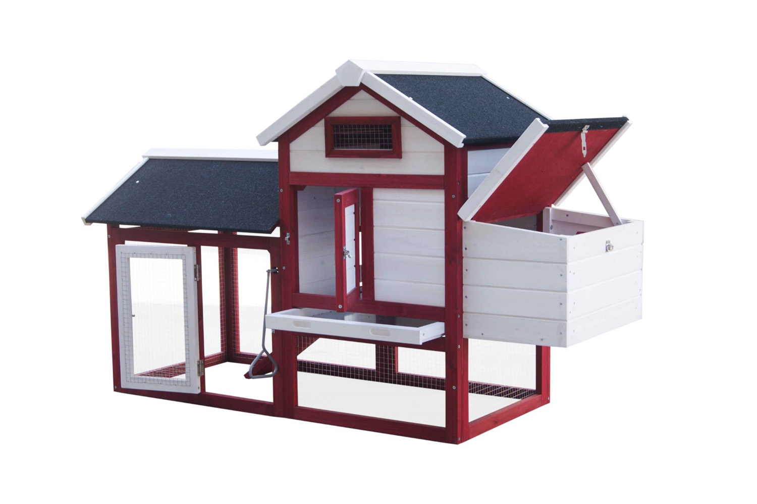 0,94 m2 / 2-3 galline / tetto bituminoso a 2 spioventi Il pollaio PO1562 è realizzato con legno FSC proveniente da foreste gestite in modo responsabile. Tinto di rosso e bianco, si integra perfettamente in qualsiasi giardino o cortile. È dotato di una zona giorno schermata per consentire alle galline di prendere aria. Si può accedere a quest’area dall’esterno attraverso la porta schermata. Il pollaio PO1562 è dotato di una zona notte, accessibile dalla zona giorno tramite una rampa, con una porta che può essere chiusa dall’esterno tramite un’apposita maniglia. Questa zona è accessibile dall’esterno attraverso una porta massiccia. La zona notte è posizionata sopra un cassetto zincato per gli escrementi, che ne facilita la pulizia. Il pollaio è dotato di una cassetta nido con 2 scomparti accessibili dall’esterno tramite una botola per facilitare la raccolta delle uova.