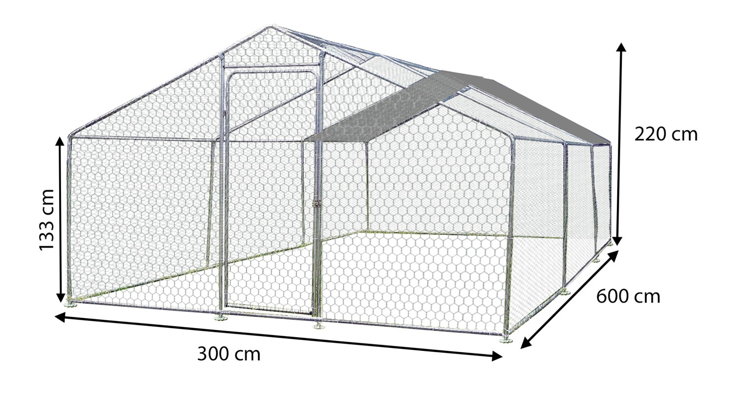 La struttura del recinto è costituita da tubi di acciaio zincato da 32 mm di diametro, rivestiti con una rete diamantata zincata di 4 cm. La fornitura comprende anche picchetti di fissaggio per una maggiore stabilità. Facile da montare, il recinto offre un’ampia area di 18 m² che può ospitare da 8 a 20 galline, completando perfettamente l’area di allevamento.